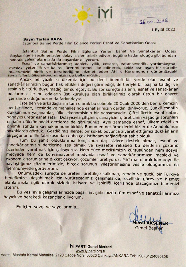 İstanbul Sahne Perde Film Eğlence Yerleri Esnaf ve Sanatkârları Odası Başkanlığına 2. kez seçilen Başkanımız Terlan Kaya’ya tebrik mektubu gönderen İYİ PARTİ Genel Başkanı Meral Akşener ‘Ahilik Kurumunun günümüzdeki temsilcileri ülke ekonomimizin bel kemiğisiniz.’ dedi.